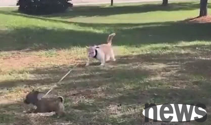 No matter how the dog urges, the orange cat has been moving forward calmly.