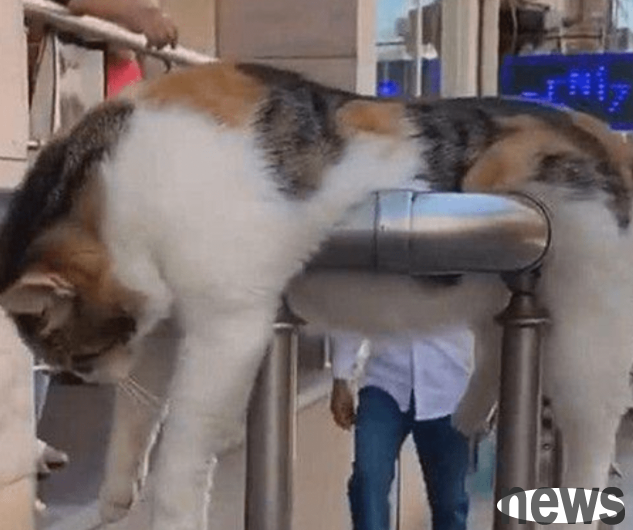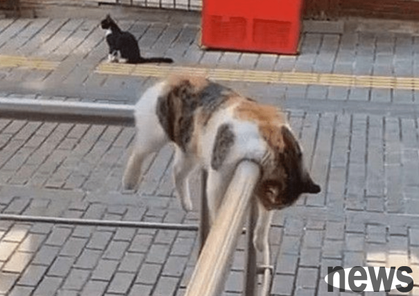 This man was taking a walk after dinner when he saw a calico cat lying on the fence on the side of the road? After looking carefully, I found that it was hanging on the railing above. Many passers-by found it interesting after seeing it, so they all came closer to have a look at it. What on earth was it doing?