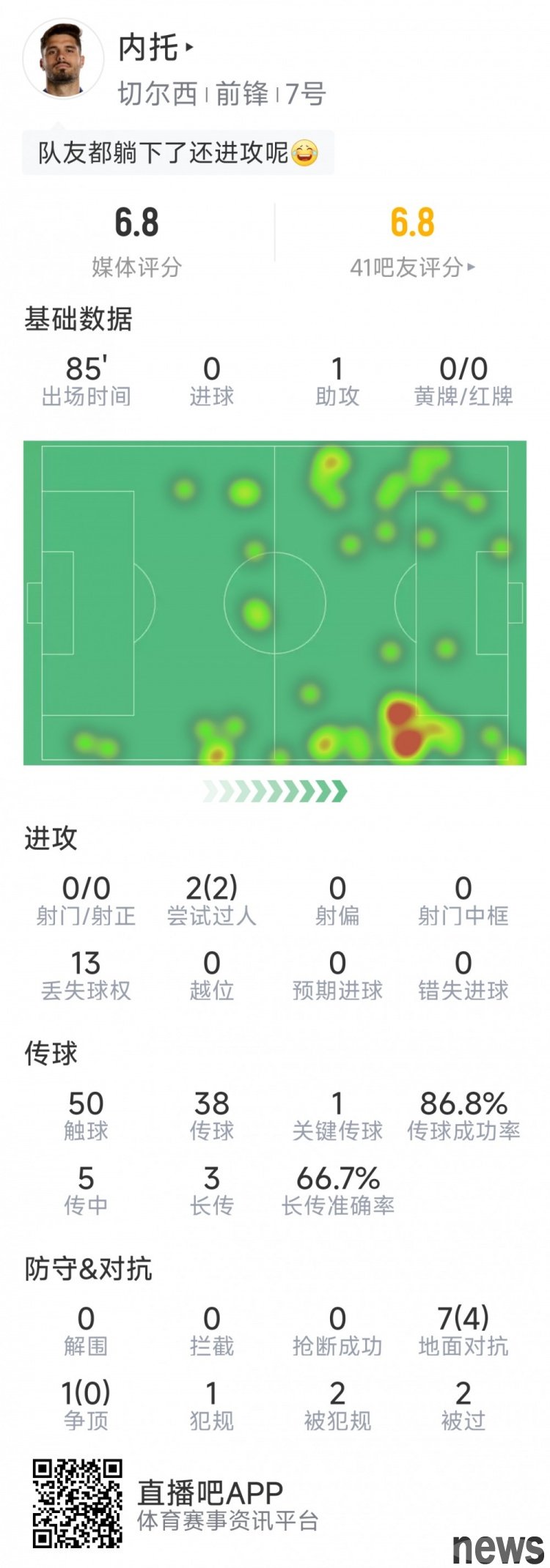Neto s statistics for this game: 1 assist, 2 successful dribbles, 0 shots, 1 key pass